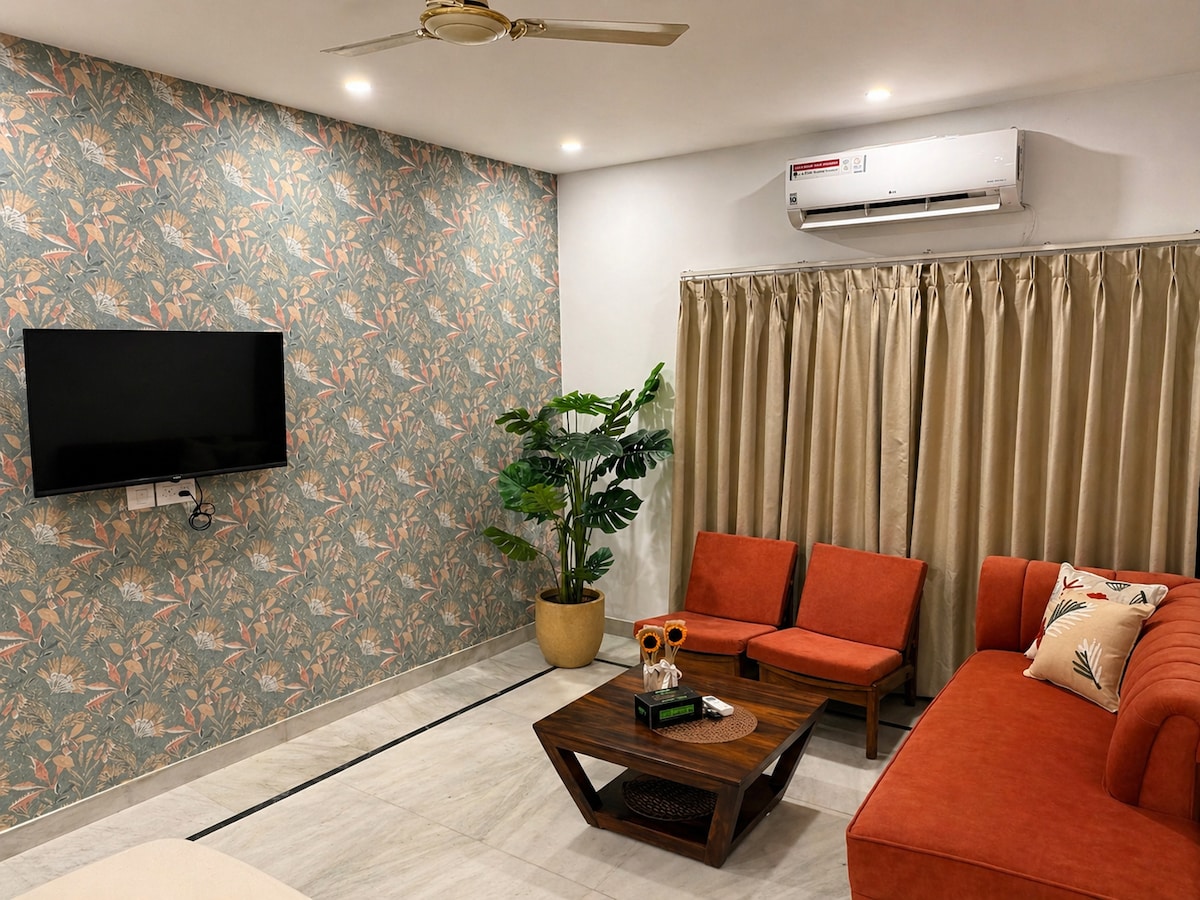 Ālaya | Entire Private Floor with Luxurious 2 Bedrooms and a Sunlit Patio |Sector 42 Imagine having an entire private floor to yourself, tucked away on the 2nd floor (accessed via staircase; no lift) in a calm residential neighbourhood. Step into a thoughtfully designed home with two spacious bedrooms, a connected washroom, and a fully equipped kitchen. Now picture yourself stepping out onto the large private patio, your own open-air retreat. A space designed for guests who value elegance!