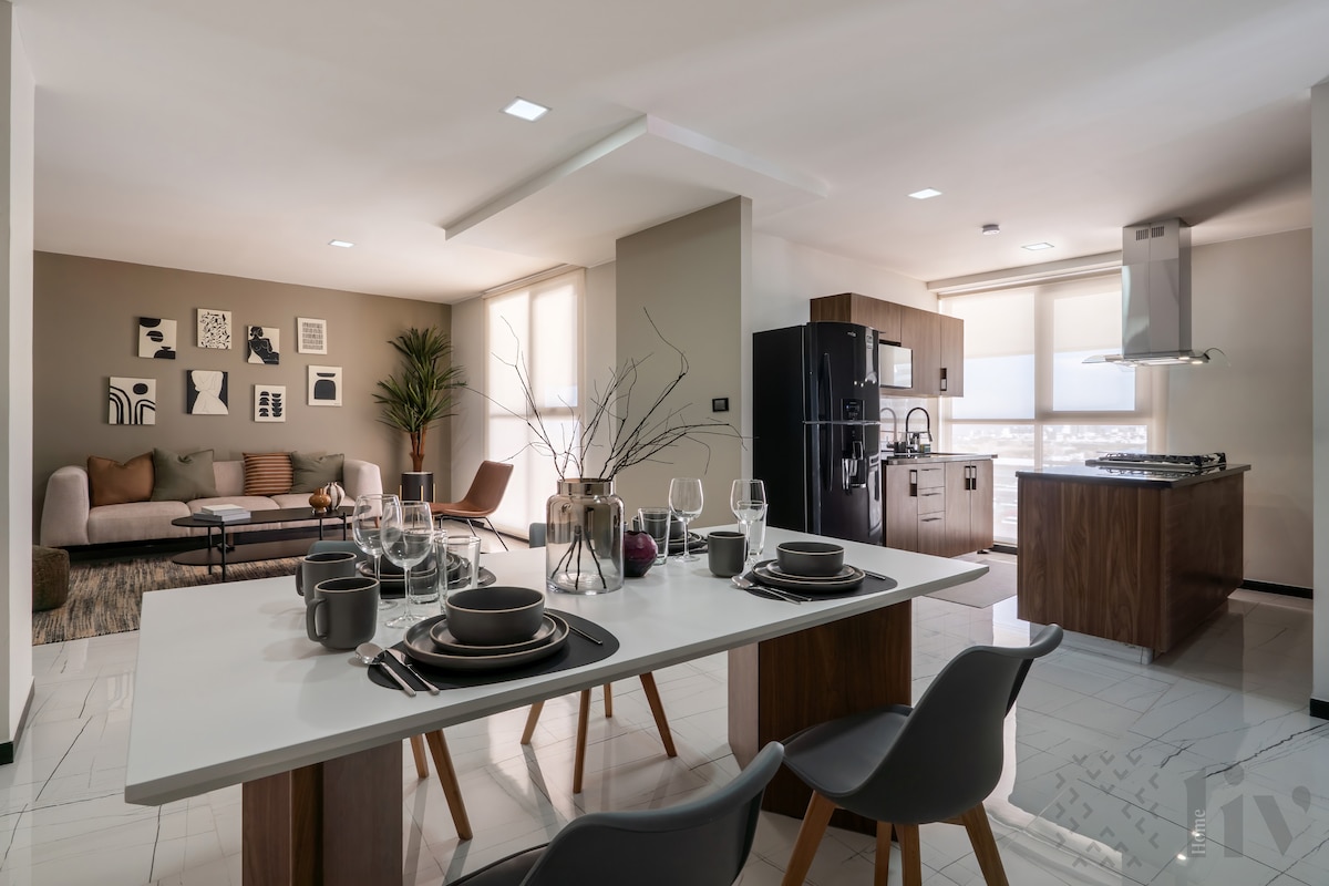 Enjoy an unforgettable sunset with panoramic views of the Querétaro skyline from the hot tub. Premium apartment with modern design and smart technology: • PS5 • Sonos sound • Alexa • Tablet with access to apps Amenities: covered pool, hot tub, fully equipped gym, spa, sky bar and games room. Strategic location: • 10 minutes from the Historic Centre • 5 minutes from the Convention Centre • Close to main avenues and the corporate area Ideal for getaways or business trips.