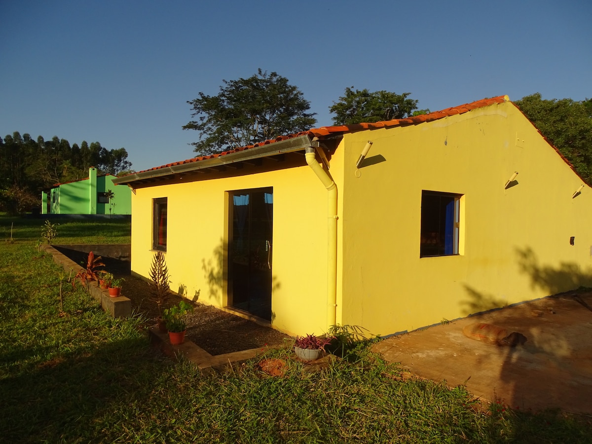 The cozy guest house is idyllically situated in front of the mountain “Cerro Acahay” in the countryside and invites you to relax or to hike up the “local mountain”. The property is easily accessible as it is located directly on the asphalt road. However, the guest house itself is approx. 300 meters from the road. Next to the house is a Qunicho / a free-standing covered terrace with hammocks, which invites you to linger.