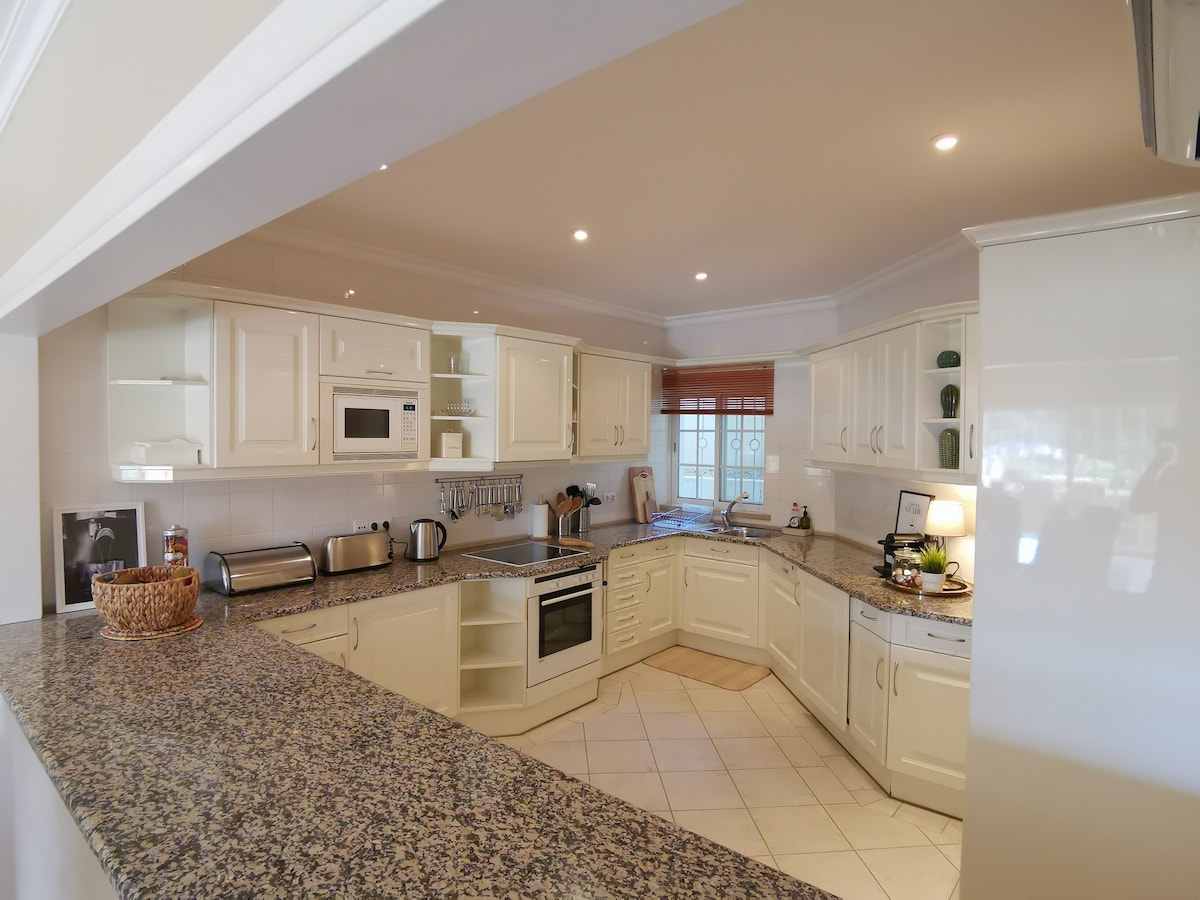 Spacious and comfortable 140m2 apartment located in the magnificent Vale do Lobo seaside resort, in Algarve 5 minutes from the beach. In front of the Vale do Lobo Tennis Academy (tennis, padel, swimming pool, gym), surrounded by beautiful golf courses and beaches -2 + 1 bedrooms (the 3rd bedroom is perfectly furnished like the other 2 but is in the basement) -2 bathrooms -large 40m2 terrace with garden furniture, deckchairs & BBQ -smart TV -Wifi -air conditioning & heating -free outdoor parking
