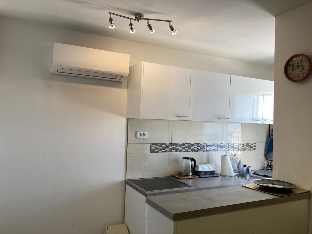 Le studio est en bord de mer et se trouve au premier étage. Il comprend une terrace de 70m2 privée avec vue sur la mer. Le logement est à 10 minutes à pied du centre ville et à proximité (juste à côté) d'un petit supermarché. Le studio peut accueillir 2 voyageurs adultes. Un clic clac est également disponible pour accueillir un enfant.