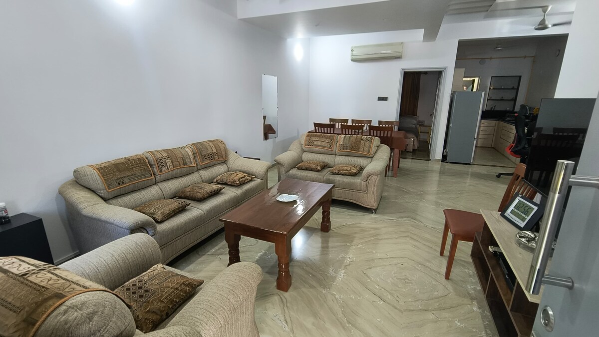 Well-furnished spacious apartment with AC bedrooms with Dresser/Cupboard, King Size bed with attached bathroom. Beautiful breezy and nice garden view balcony, free Wi-Fi, feels likes your own home. Mosquito & dust free apartment. This place is great for NRI families. Peaceful, comfortable & safe. Kitchen with all appliances & utensils. Grocery & Vegetable market within walking distance. Monthly & weekly discounted in rates. Flexible check in time.