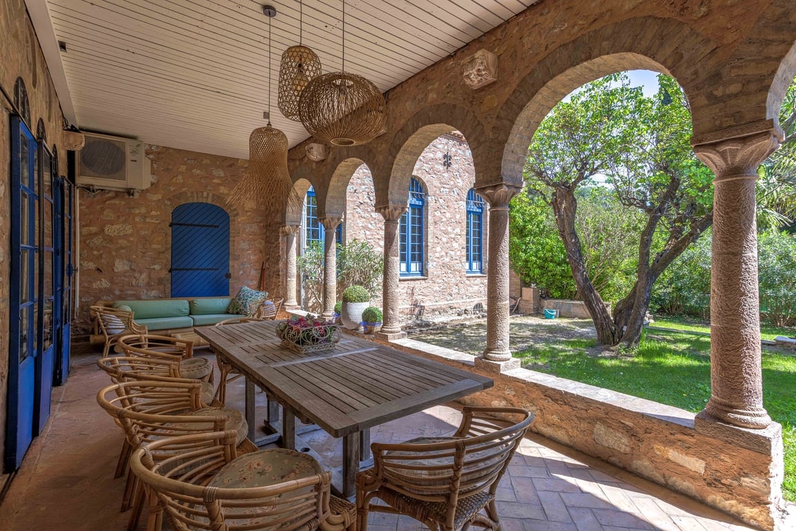 Modern Provençal Luxury Villa with Boho Chic Style Located in a quiet and peaceful residence, this elegant Modern Provençal villa blends luxury with refined Boho chic design. The setting offers privacy, tranquility, and comfort — ideal for relaxing Côte d’Azur holidays. The residence also features a tennis court, perfect for active guests who enjoy sports during their stay. A charming 15–20 minute scenic walking path leads directly to the center of Grimaud, allowing you to enjoy the village.
