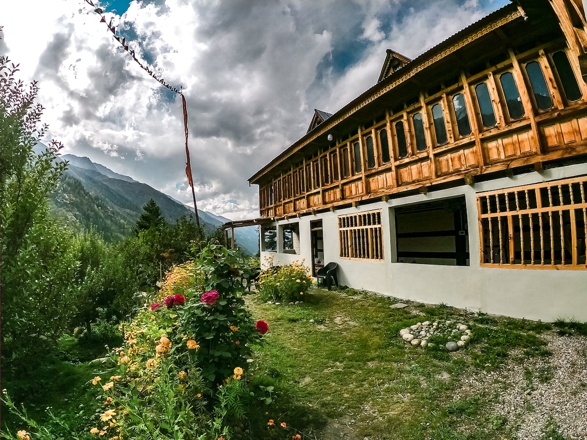 Relax with the whole family at this peaceful place to stay.And the best part is,you get the direct view of kinnuar kailash from your room.