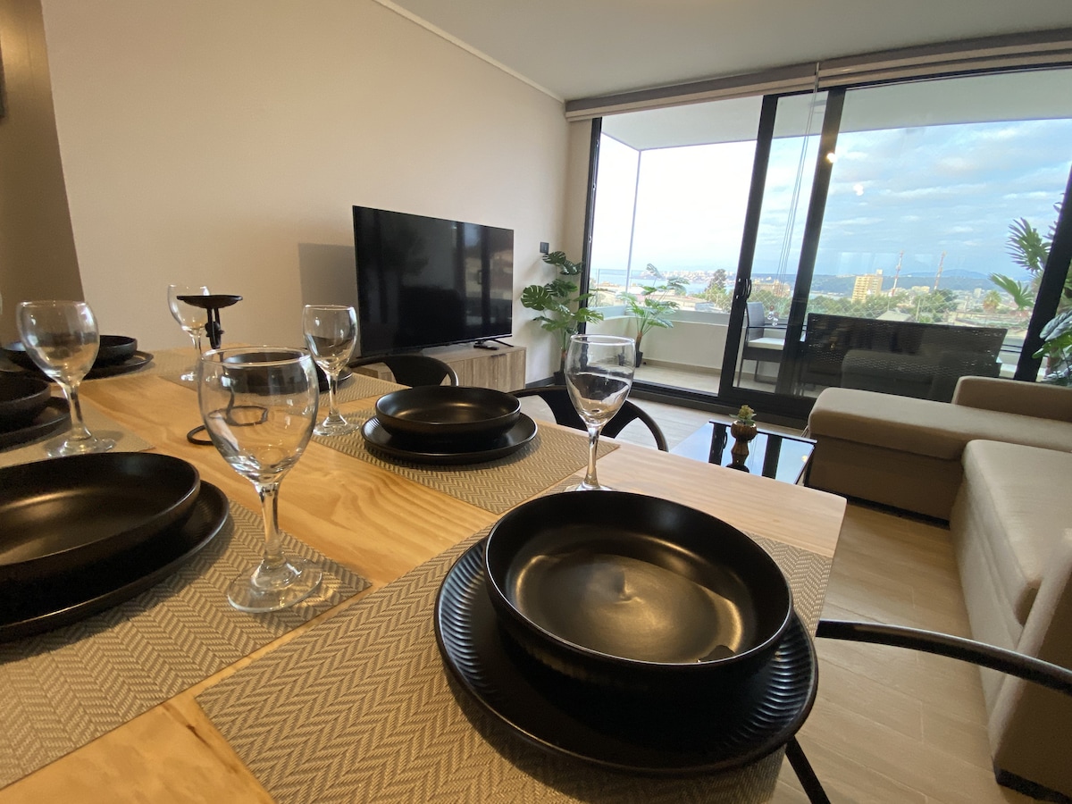 Take it easy at this unique and tranquil getaway. An apartment with an incredible unobstructed ocean view (view from Valparaíso to Concón). Beautiful new apartment located in Recreo neighborhood with 2 bedrooms, 2 bathrooms, terrace and kitchenette. Quiet residential neighborhood Kitchen for everyday cooking Fiber Optic WiFi (500 mbps symmetric) Parking garage Includes sheets and towels for 4 guests 42-inch TV in living room with Roku Building with a pool If you have visitors, please coordinate with us