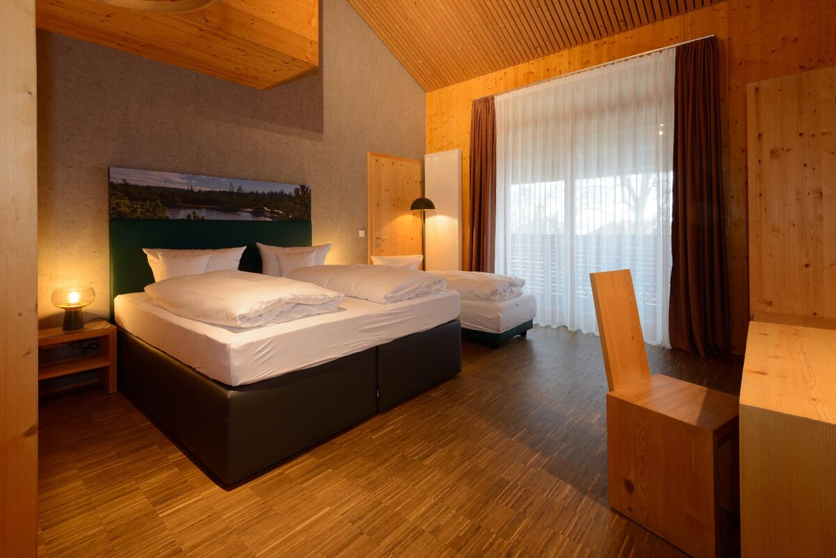 Arrive, switch off, enjoy: The Waldklang Suite offers you an exclusive wellness room with a private sauna and a private whirlpool – all to yourself. The hot tub is located on a spacious balcony with breathtaking views of the untouched nature while you listen to the gentle sound of the stream – pure relaxation for body and soul. In summer, you can sit here in the front row overlooking the spa park and listen to the live band events in a relaxed atmosphere.