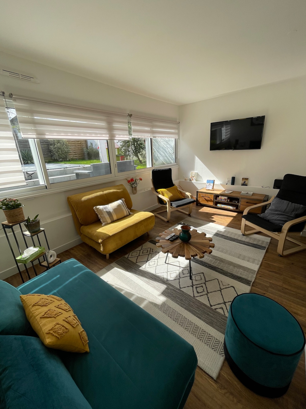 Three-room accommodation, next to our house, that can accommodate 4 people, 10 min north of Rennes (10 km) and 45 min from Saint-Malo and Mont Saint-Michel. We are located near Cap Malo (cinema, bowling, shops, golf, restaurants...), and 200 m from a bakery, and a farm relay. Ideal also for someone coming to work in Rennes and wanting to avoid downtown Rennes. You can easily park on our street, which is a cul-de-sac.