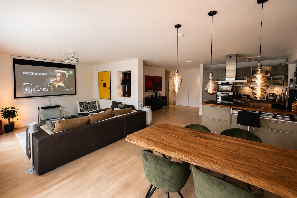 Enjoy Cologne at the highest level in our cinema suite. Welcome to this luxurious 118 m² maisonette apartment that offers everything you need for a great stay in Cologne: → BOX SPRING BED (king size) → parking space available → 100 inch home cinema & popcorn machine → Kitchen & fully automatic machine → Reading corner → Walking distance to everything your heart desires. → Perfect connection by car or public transport. ☆"You really feel right at home. We would book with Svyvo again and again!"