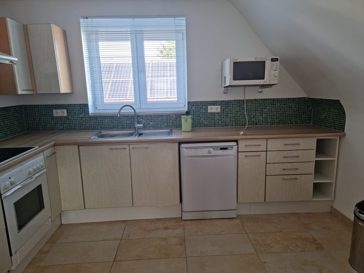 Bright ground-floor apartment with a fantastic location on the edge of the forest, eat-in kitchen (fully equipped with all electrical appliances), microwave, oven, stove, kettle, coffee machine, iron. Living room with double bed and sofa bed, 42" TV with USB and HDMI, daylight bathroom, terrace, garden plot 1200 sqm with playground and tree house. In addition, another bed is possible. Important information: The apartment must be left clean when moving out.