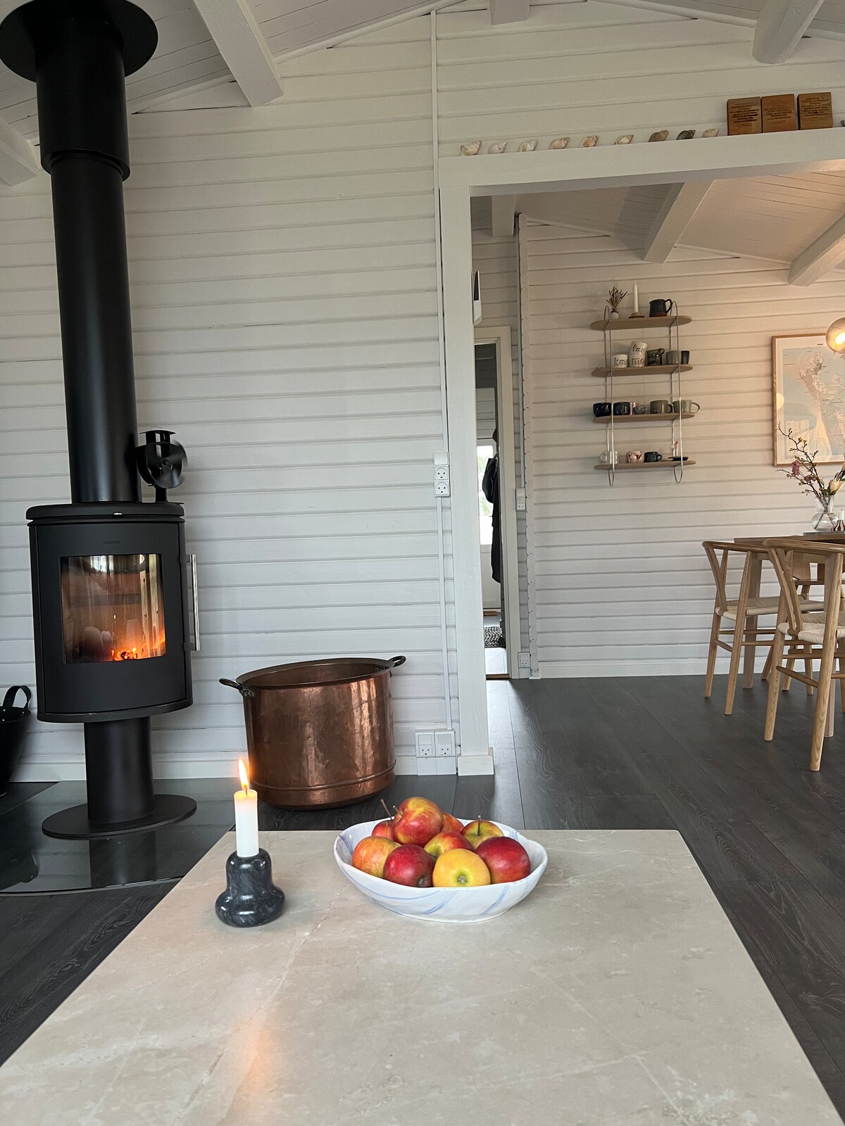 Welcome inside With its cozy atmosphere and sensible layout, a family of four can be fine here, and the house will also fit well for a couple's vacation. If you're mostly in the mood to spend a whole day with crossword puzzles, board games and cozy conversation, it's great to stay in the living room, which is equipped with a wood-burning stove if the weather is a bit chilly. If you get hungry, you can conjure up something quickly in the open kitchen – and of course you can also spend a long time picking at the food.