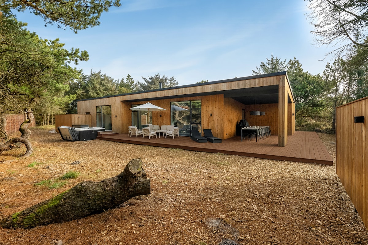 Visit this idyllic, totally newly renovated wooden cottage with a wonderful atmosphere. Located on a large hilly wooded area in Skuldbøl. A nice and quiet place, with scenic surroundings and rich wildlife. New large terrace with canopy in the middle of the forest. Walking distance of 8 minutes to fresh air at Ringkøbing Fjord. The charming house offers the beautiful nature inside, and is a lovely bright interior, which invites you to a cozy and relaxing vacation. Here is tranquility and atmosphere on the beautiful terraces.