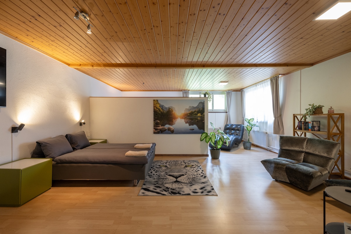 This spacious apartment is located in the cozy attic of a typical Emmental farmhouse named Bühlmenschwand. In addition to the hosts, friendly dogs, cats, sheep, donkeys and chickens live on the Bühlmenschwand farm. From here you can enjoy beautiful walks through the adjacent woods and meadows, or further discover the Emmental by car or bike.