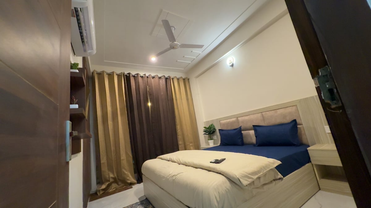 A calm and cozy 1BHK—perfect for couples, small families, and peaceful stays. A very comfortable, pet-friendly stay for families and friends with free parking and lift access. The apartment features a spacious, well-equipped living room, a functional kitchen with a fridge and stovetop, and one separate rooms with clean, private attached bathrooms. Guests can enjoy cooking, relaxing, and listening to music with loved ones.