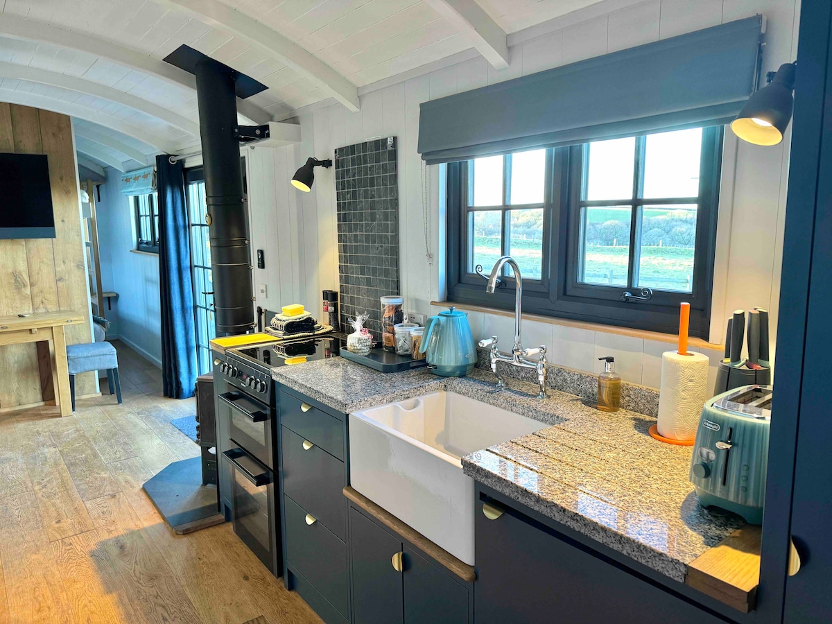A luxury Shepherds Hut set in the heart of Devon is easily accessible to Dartmoor and Bude beach. A cosy log burning stove inside, secure garden, your own field which is totally off grid, gives you the space and quiet to relax. Living area -a TV sofa which also doubles as a sofa bed. You are welcome to have a firepit and BBQ's in the fields. Our Blacknose Valais sheep are nearby to keep you company. Sit watch amazing display of stars, no light pollution. (dog friendly, flexible cancellation)