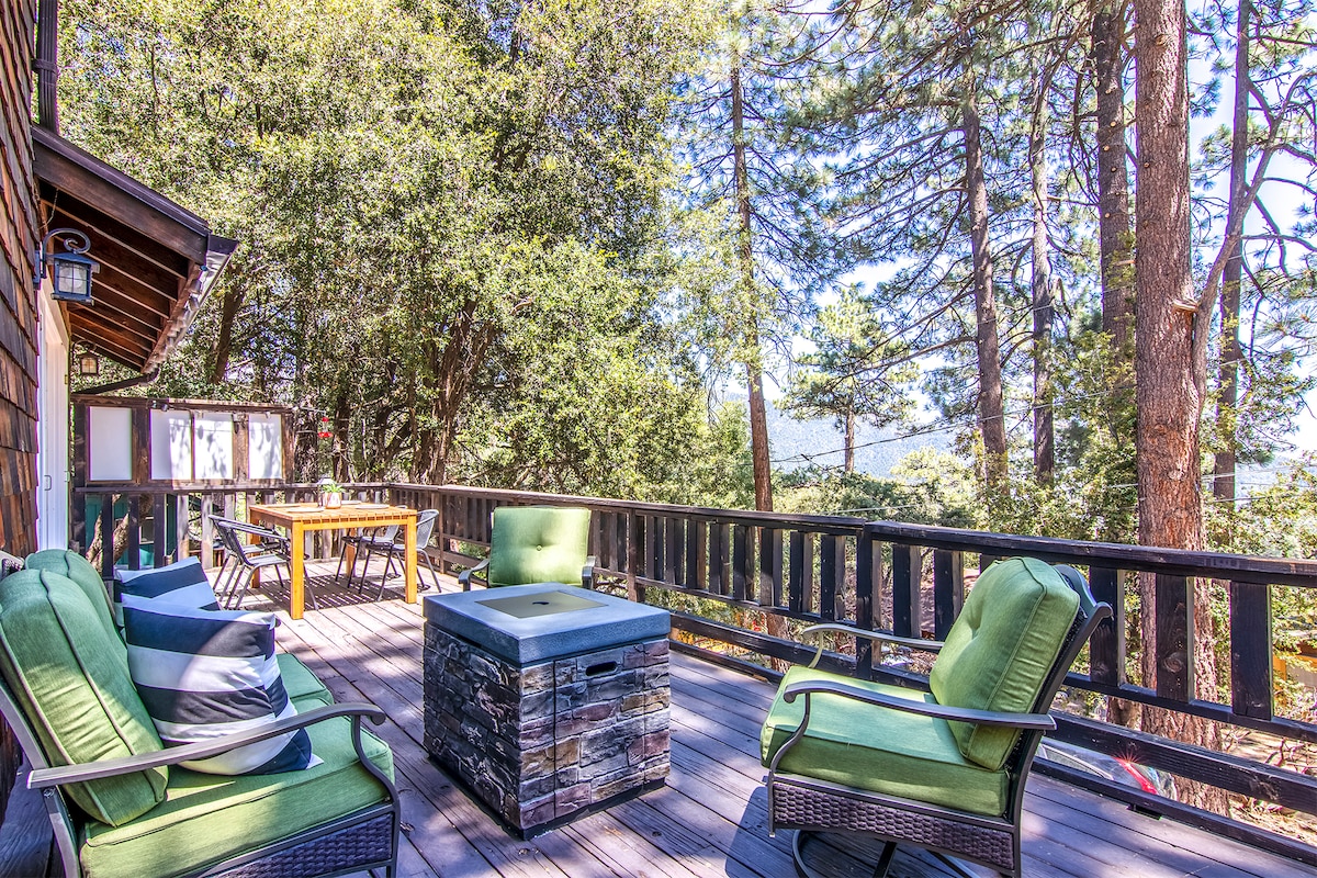 Perched high on Idyllwild’s North Ridge, Treetop Terrace sits in a canopy of oak trees and offers amazing views from its expansive upper deck. Enjoy the charm of its mid-century architecture and vintage-inspired furnishings. Features include floor-to-ceiling windows, an open-concept layout, a recreation room, and wheelchair accessibility. Conveniently located 3-minutes from the village, it is easy to enjoy the charms of Idyllwild and the beautiful San Jacinto mountains from the Treetop Terrace.