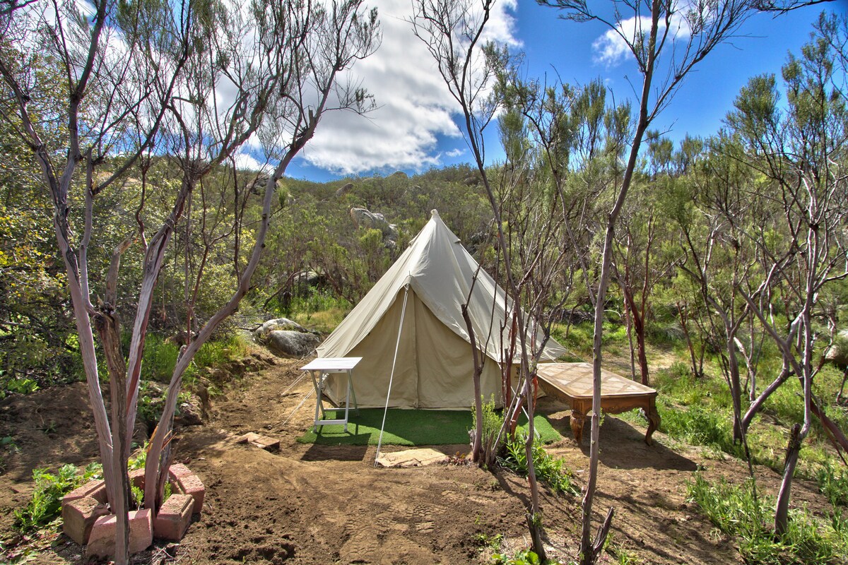 The Bend is an OFF GRID Oasis in the Foothills of the Anza-Berrego Mountains. Nestled betw Palm Springs & Wine Country. This Shabby Chic Tent sits in our OASIS Area. A 20' Canvas Bulb Tent w/ clear ceiling for STAR GAZING. Outfitted w/ Organic Queen Size Mattress, Bamboo Sheets, Covers, Waffle blanket & Down Comforter. Private composting flush toilet rests right outside your tent. The Oasis offers 360 degrees of breathtaking scenery! Join us for your private get away, party or events