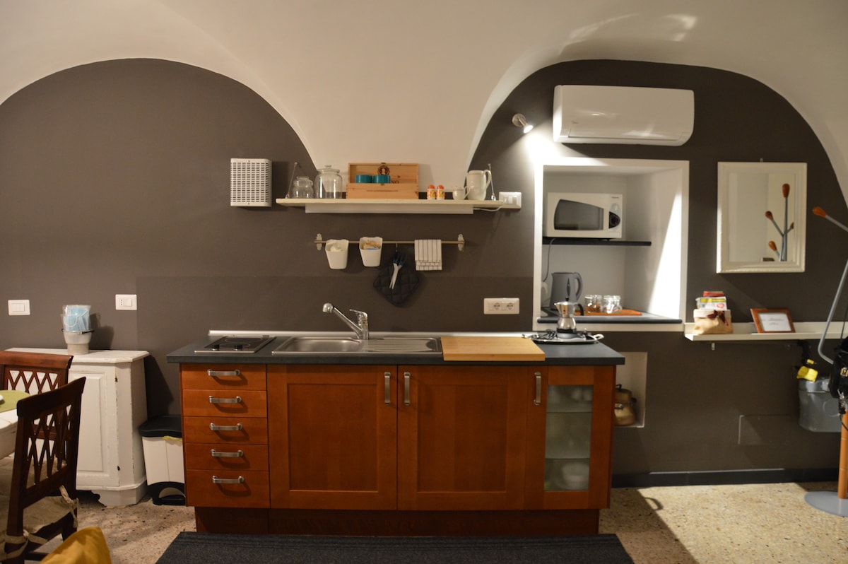 In the historic center of Serralunga d'Alba, a former barn with exposed beams and a separate entrance. Composed of a living room with kitchen and sofa bed. Mezzanine sleeping area with double bed. It is 10 km from Monforte, Barolo and 15 km from Alba and La Morra.