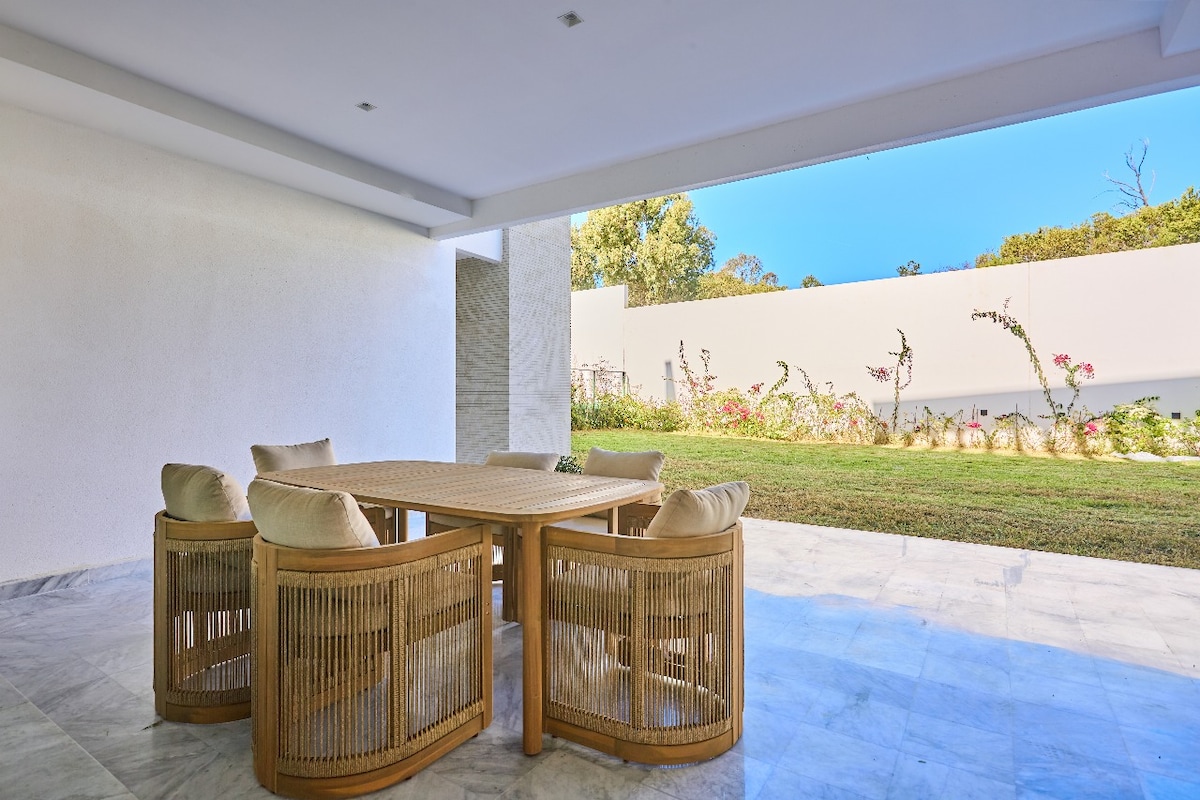 Discover peace and elegance in this spacious luxury apartment nestled in the hills of Tangier, near the famous Rmilat Park. Surrounded by a beautiful forest, the residence offers a perfect escape for those seeking nature, comfort, and privacy. Highlights: ✔Elegant living room ✔Fully equipped modern kitchen ✔Access to a shared swimming pool surrounded by greenery ✔A few minutes from Rmilat Park, the Cap Spartel Lighthouse, and Achakkar Beach ✔Private Garden ✔Exterior security cameras