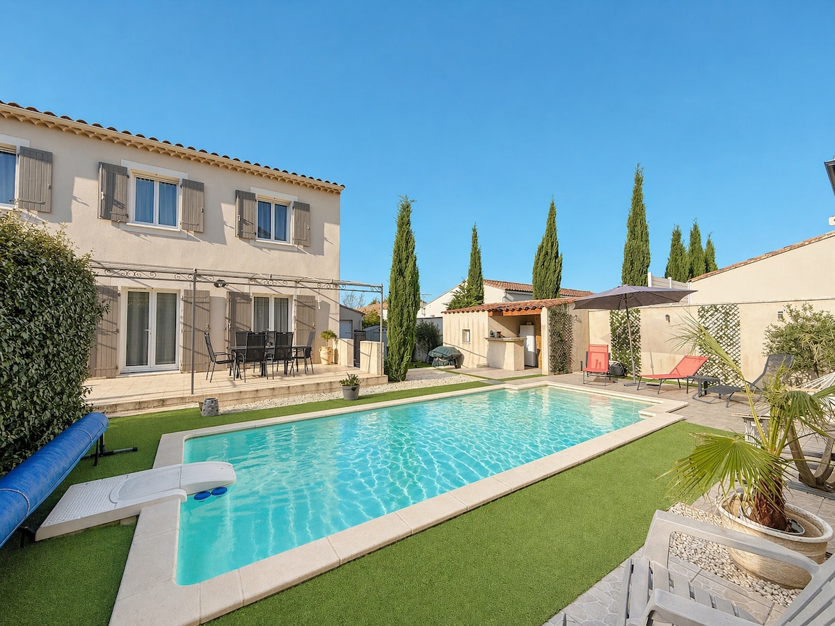 4 étoiles au classement "meublés de tourisme".Villa l'Annexe proche d'Avignon avec piscine extérieure sécurisée,chauffée sur demande,terrain de boules,jardin,cuisine extérieure,salle de sport. Quatre chambres personnalisées dotées d'une literie hôtelière. Située dans un joli village avec de nombreux commerces (boulangerie,pharmacie,supermarché, glacier,restaurants,...) et situé à proximité du Pont du Gard, d'Avignon, de Nimes et à moins d'une heure de la Camargue. Marché tous les dimanches.