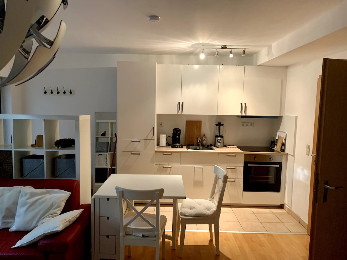 Die 60qm Wohnung ist frisch renoviert und teilweise neu möbliert: ein Schlafzimmer, Bett 160*200cm ein Badezimmer, mit Badewanne/Dusche eine voll ausgestattete Wohnküche mit Nespresso-Kaffeemaschine, Geschirrspüler, Couch, Smart-TV, Apple-TV, Amazon-Prime ein Zimmer, das wahlweise als : - Arbeitszimmer mit Schreibtisch, Monitor, Stuhl - Kinderzimmer mit Kinderbett oder Krippe eingerichtet wird Internet 1TB/s Waschmaschine, Trockner und andere Sachen stehen in dem Keller.