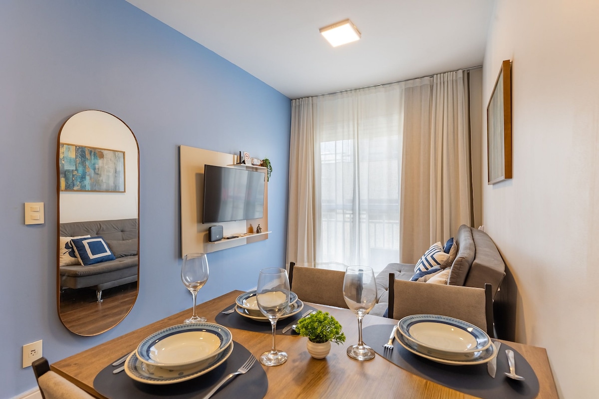 A 26m² studio with decoration signed by an architect in the heart of Jardins. Cozy atmosphere, ideal for people traveling alone, with friends, couples and families with children! We accommodate up to 4 guests with comfort and versatility We are located 3 minutes from the famous R. Oscar Freire: safe, full of restaurants, shops, pharmacies and markets In a central region, ideal for those who also want to explore important points of the city, such as Ibirapuera Park, Faria Lima Avenue, among others