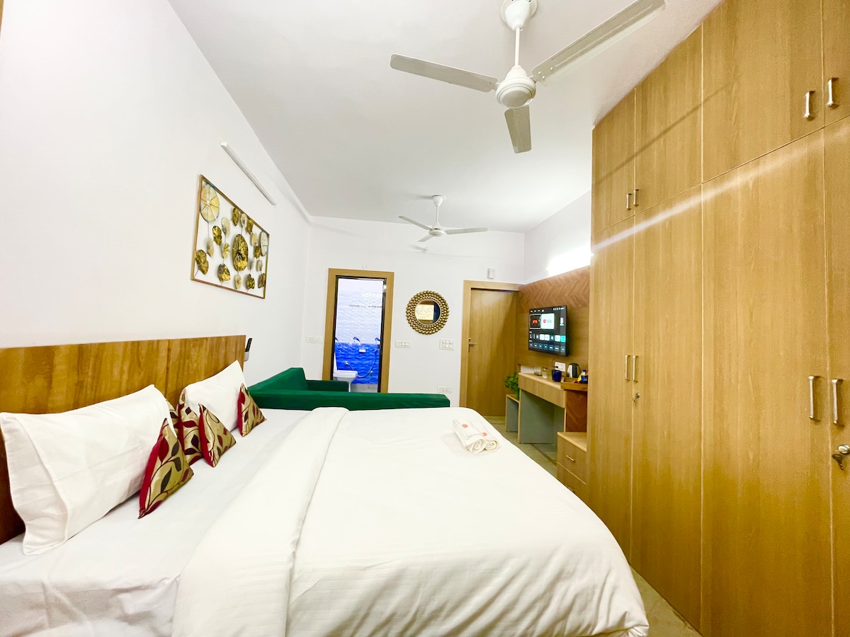 Fully furnished independent studio apartment with Bed, Room Heater, Smart TV (OTT), Robot Cleaner, Gaming Chair, Fridge, 300 Mbps WiFi, Workstation, RO, Geyser, Air Purifier, AC, Hair Dryer, Iron, Modular Kitchen with Cutlery, Dishwasher, Microwave, Washing Machine, Dryer, Kettle, Induction Stove, and Chimney. Restaurants and grocery shops available within the society. *Parking for four-wheelers subject to availability*