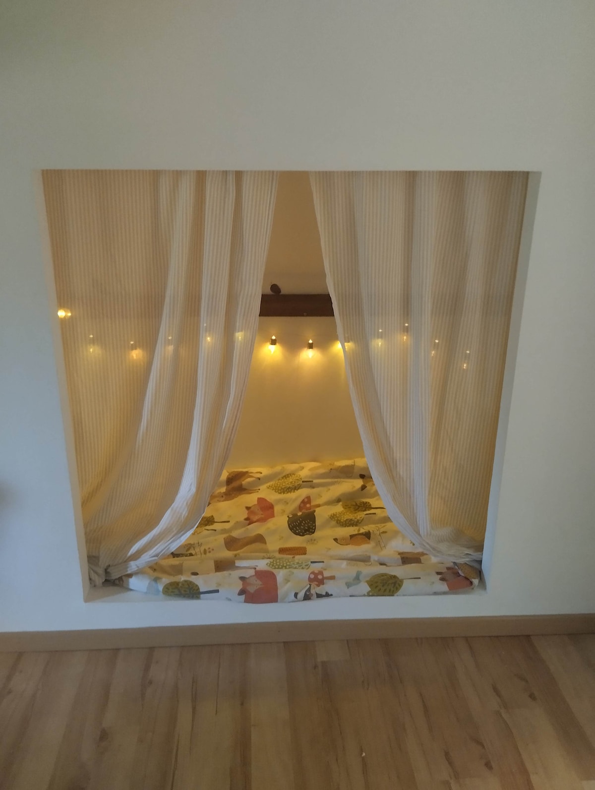 This peaceful accommodation offers a relaxing stay for the whole family, nestled in the heart of the pretty village of Neuville en Avesnois, where beautiful hiking trails await you. Ideal house for 4 adults + 1 child but possibility to accommodate 6 + 1 child with the sofa bed. Kids will love sleeping in the cabin-style bed.