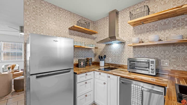Kitchen Amenities: The fully renovated kitchen is equipped with stainless steel appliances and a butcher block countertop. It's perfect for preparing meals and snacks during your stay. Be sure to check for essential kitchen supplies and utensils provided by the host.