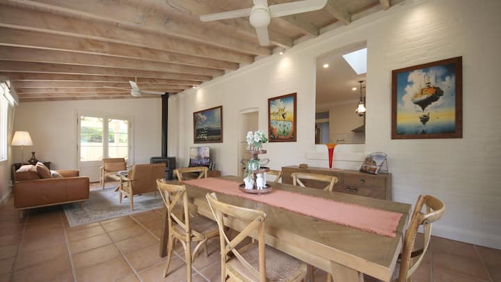 This delightful property offers accommodations tailored for couples seeking a romantic retreat or groups of friends eager to explore the rich offerings of the area. Inside this elegant home, you’ll discover a spacious living areas encompassing a dining table and a lounge suite adjacent to a cozy wood-burning fireplace.