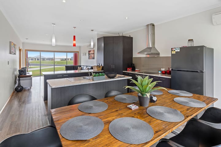 Modern kitchen with a breakfast bar, 4 stools, modern 8 seater dining table. Under bench oven, above bench cook tops, microwave, dishwasher, pantry cupboard, high quality cutlery, crockery & cooking utensils.
