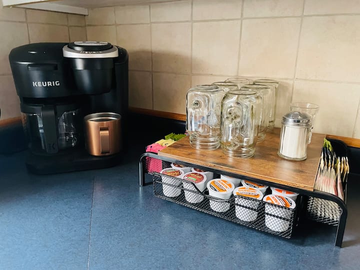 KITCHEN: Large and well equipped that includes an air fryer, Kurieg coffee maker (by the pot or by the pod), pots and pans, electric skillets, crock pot, baking sheets, toaster, and dinnerware / silverware for 8 people. Coffee, teas and sweeteners are provided along with most condiments, oils, and spices.