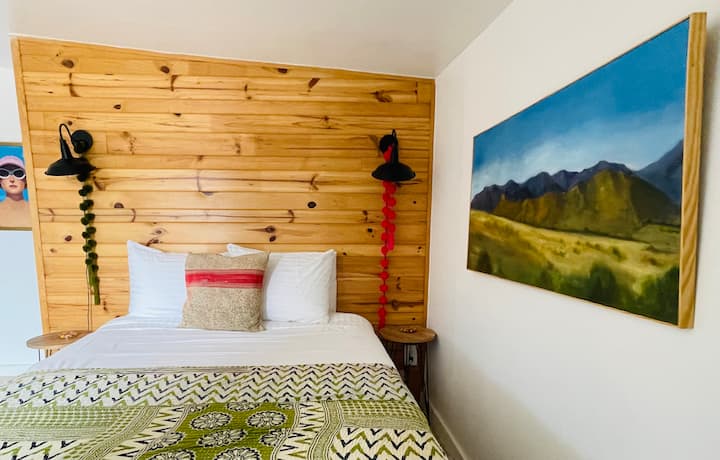 Large and private outdoor space with six foot fence all around. Small fire pit for cooking s’mores and sharing some beers over a fire. Firewood is not provided so be sure to bring some with you or pick some up at Porters Grocery. There are outdoor table, benches and chairs so you can enjoy living outside. The space is tiny but we made sure to extend the experience outside so you can stretch and enjoy the sunsets. Be sure to say “hello” to ‘Hershey’ and ‘Butthead’, the horse and goat across the alley.