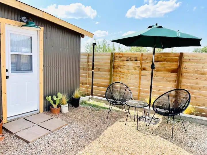 This tiny house has private entrance, private parking, private courtyard and zero shared spaces. This cozy studio space is a great getaway to explore all Marfa has to offer. Perfect for a couple, two friends, or lone travelers. Created as a mother/daughter project, this little casita was built with love.