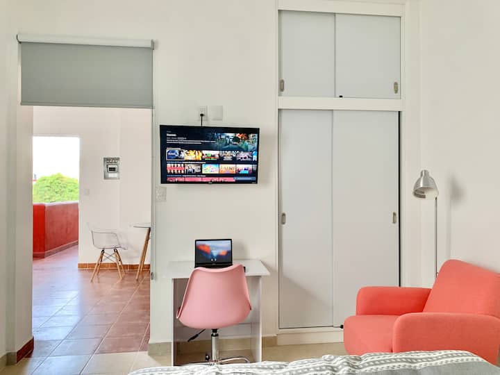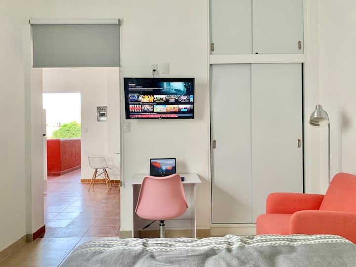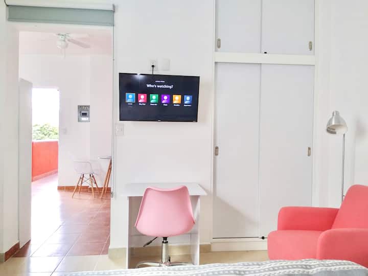 The communal terrace is on the next level where you will have a 360 degree view of the city. It has a smart TV in the bedroom with streaming services included: netflix, Amazon Prime, Disney +, Star +, Paramount+, HBO MAX. There are many options for sports on Disney + you can access ESPN and watch NFL, MLB, NBA, PGA, Nascar, College Footballl, NCAA, and all sorts of other college sports. Also, boxing, Tenis, NHL, Wimbledon, Indycar, PGA Tour, and all varieties of sports. Within the prime video app you can watch UFC, MLB, NBA, NFL, F1, WWE. So we have streaming services with movies, series and all sort of live sports.