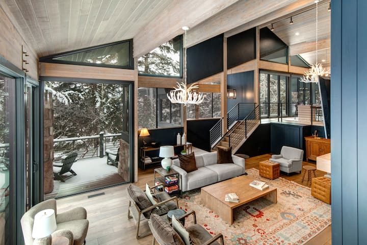 Prepare meals in the spacious butler’s pantry and gourmet, eat-in-kitchen with brand new Thermador appliances and high-end finishes. Meanwhile, the dining area offers 180-degree views of gorgeous pine trees and parts of Bald Mountain – home to the Deer Valley Ski Resort. The large dining area seats eight under a delicate modern chandelier. From here, you can directly access the main floor balcony, where you’ll find a grill for family barbecues. or step down into the great room, characterized by its 20 feet vaulted ceilings, antler chandelier, and plentiful seating.