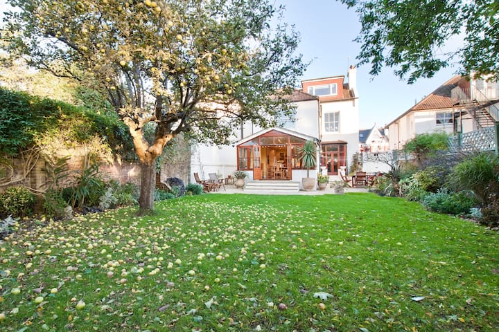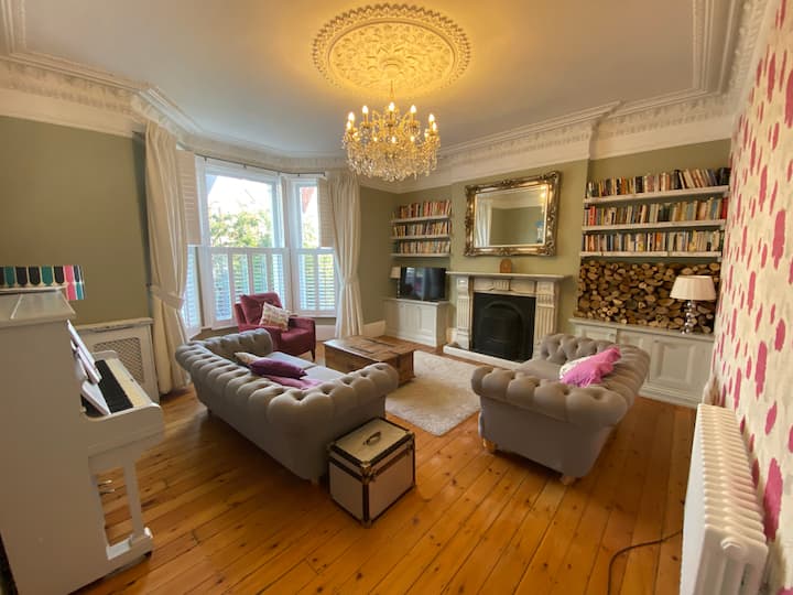 Wake up in a beautiful detached Edwardian Villa in the smartest area of Hove. Six large double bedrooms (one has distant seaviews) 3.5 bathrooms, huge bright kitchen/diner. Boiling water tap, corian island & large west-facing garden. Marble fireplaces, smart TV (Netflix & Amazon), exposed brickwork, shutters, sumptuous coving, high ceilings, two roll top baths, chandeliers. 3min to Hove station & Hove Park. 14min walk to beach. Two car parking spaces. See guidebook for fun & food suggestions