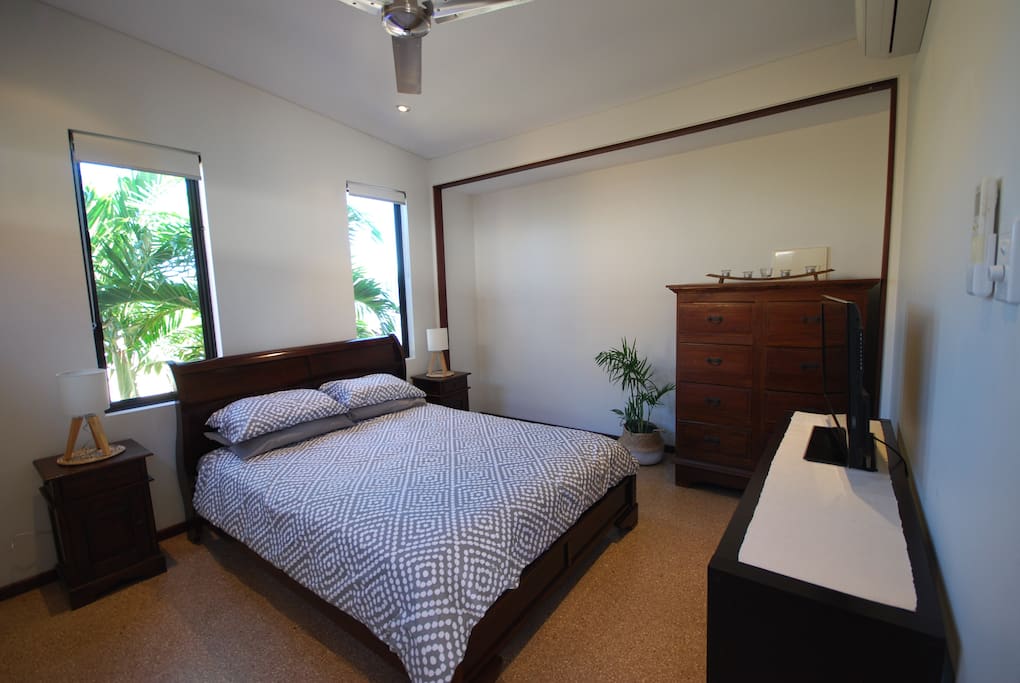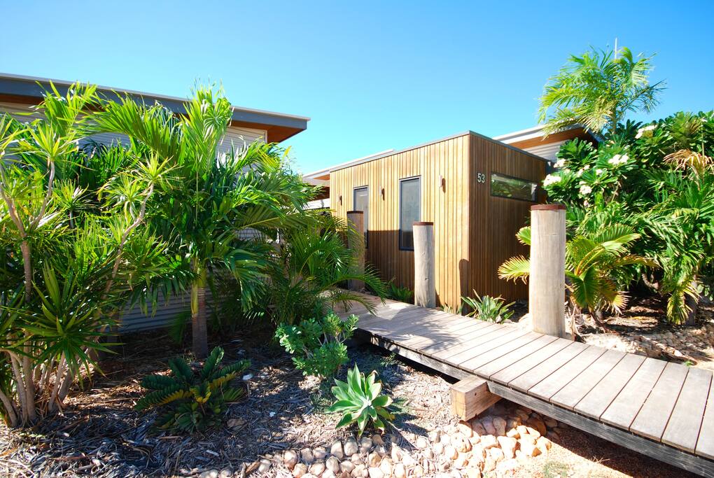 Relax, kick the shoes off and feel at home in our modern tranquil studio retreat based in Exmouth near the Ningaloo Reef. Master bedroom with Queen Bed, private self-contained Kitchen/living area and private bathroom with grassed courtyard adjacent. Enjoy your own space with the option of a large shared decking area with access to BBQ facilities, across from our respectable family home. Suitable for singles or couples. We also have a friendly female dog who loves meeting our guests.