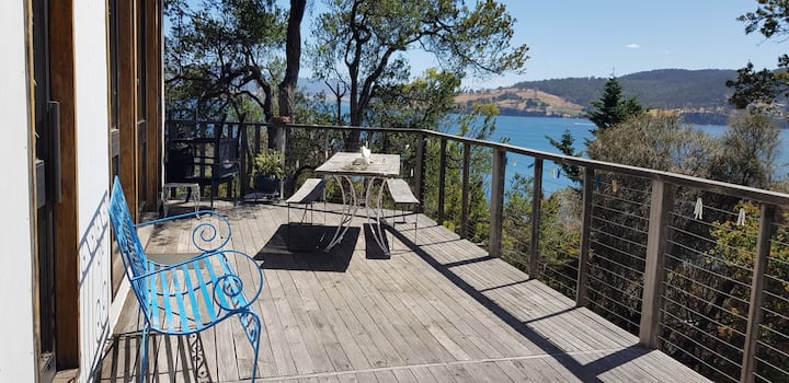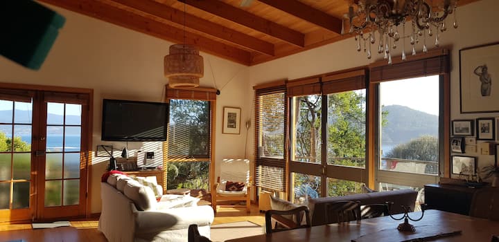 This light filled home, with outdoor hot shower post swim, & cosy wood fire for winter is set amidst the tree tops with wonderful surrounding water and mountain views, and spectacular sunsets .