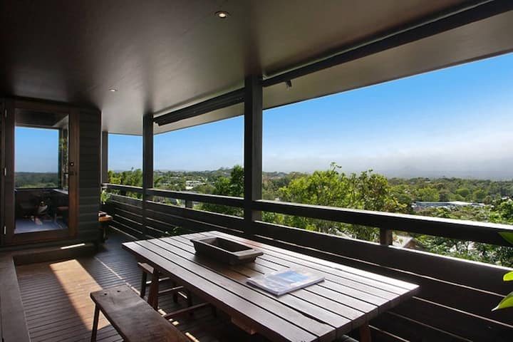 Our unique home in Noosa Heads, perched high on Noosa Hill, has been designed to allow guests to experience living in smaller yet inspiring spaces. We aim to provide a unique holiday experience, challenging conventional living and inspiring a sustainable & healthy lifestyle with a focus on nurturing the mind, body and spirit. Each item in this ‘pull apart’ home has been carefully considered and designed by ourselves or sourced from like-minded makers. The feel is private and spacious, with a dark bedroom designed specifically for deep sleep, and a shower/dressing area with stunning views of the Noosa surrounds. Instead of television and computers, enjoy beautiful sunsets on the deck, a private bath with a view, immerse yourself in a good book, or create a delicious meal from fresh local produce.