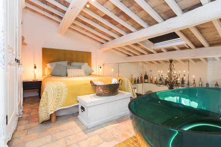 Upstairs, the first floor offers a mezzanine-style bedroom with a freestanding bathtub in the room and a door that provides privacy from the stairwell. The second bedroom is located on the top floor, just a few steps up, and opens directly into a cozy en-suite space. From here, a discreet hatch leads to stairs taking you up to the private rooftop terrace—perfect for enjoying a chilled glass of Rosé
