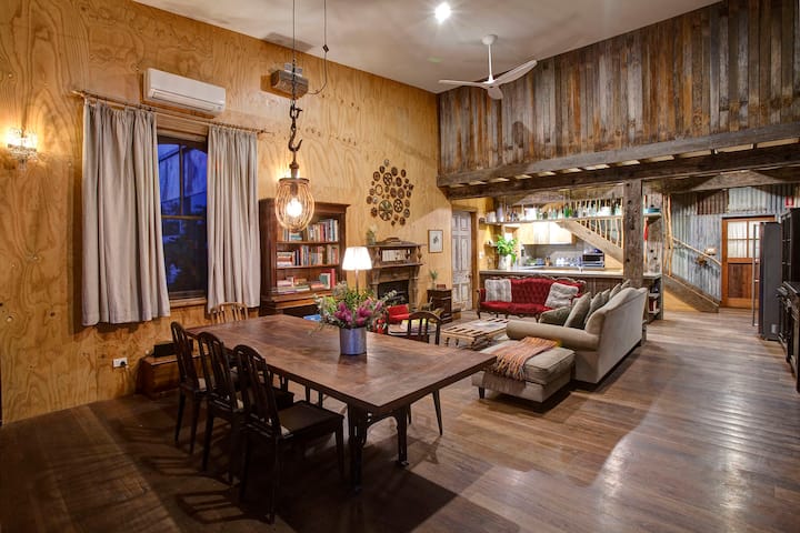 Entering into The Shed via beautiful vintage doors you find yourself in a large living area that includes a rustic fireplace surrounded by comfy lounges and chairs, an 8 seater farmhouse dining table, and a fully equipped kitchen including a large stove and oven.