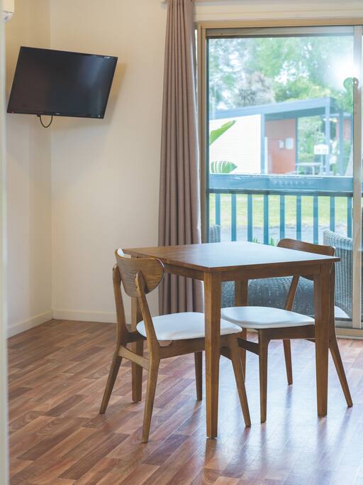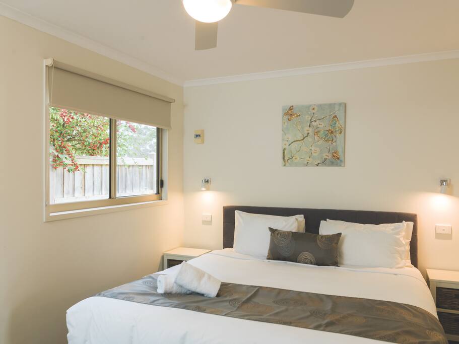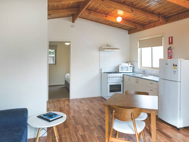 Fully self contained, kitchen, en suite, lounge and deck, Split system heating/cooling.