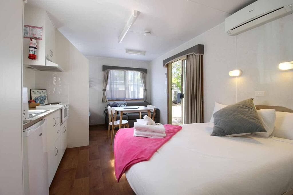 This cute and cosy cabin is an open plan layout with a double bed, kitchen, dining , lounge area, and a set of bunks in the one room.
