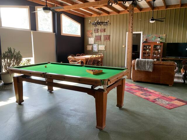 Huge entertaining area with billiard table and another separate living space in the kitchen area.