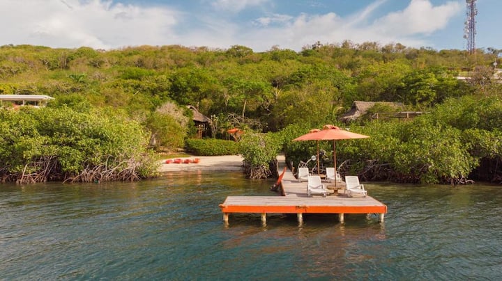 In the cienga de cholon, in a privileged location, protected by mangroves and between crystal clear waters, this hotel is hidden. Just 50 minutes from Cartagena, the Hotel Playascondida has 5 rooms, and can accommodate 20 people in multiple accommodation; 4 people per room. Equipped with a swimming pool, jetty, dining room, viewpoint, private beach and vegetation that is over 100 years old.