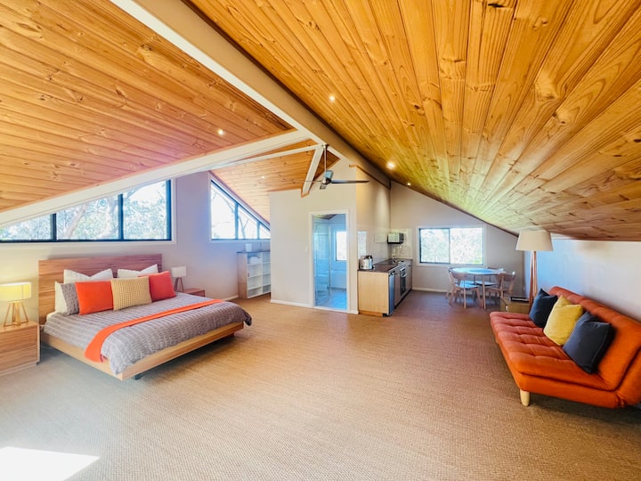 As travellers we know how good it feels to arrive at a place that's got creature comforts and feels a bit luxurious, so we've definitely created that feeling in our studio. It's decorated with brand new contemporary furniture, it has views across the mountains and the bathroom looks straight out onto the bush. There's something about taking a shower or bath right in the middle of nature that is just so relaxing. It makes you feel a million miles away, like you're truly on holiday.