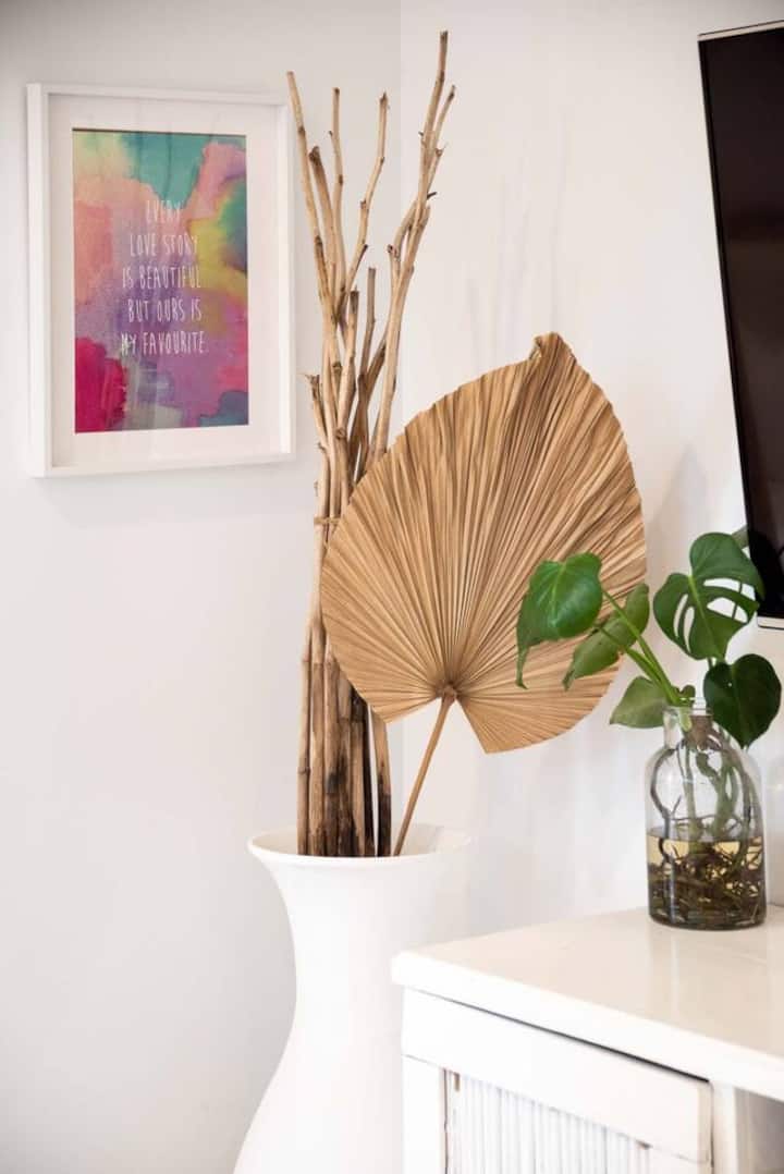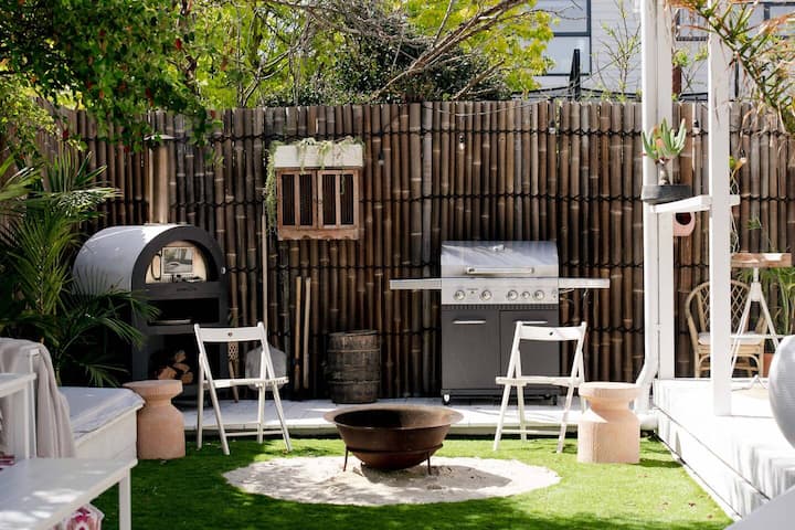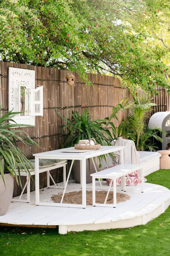 The coastal boho aesthetic is intrinsic to our home, setting the tone for calm and tranquility upon arrival at this Surf Coast beach house. From the moment you arrive, you will be greeted by palms, cacti and an outdoor shower. A bamboo fence-line is the backdrop to tropical gardens and relaxed holiday vibes, leading to a backyard that offers restful spots to sit, swing, cook, lay and play.