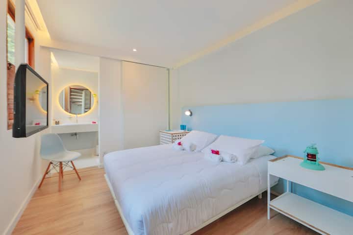 Chucis Room: has 16m2 and has a minibar, split air conditioning, 1 queen size bed, individually bagged spring mattress, bathroom with hot water, door with access to the garden, with terrace and hammock.