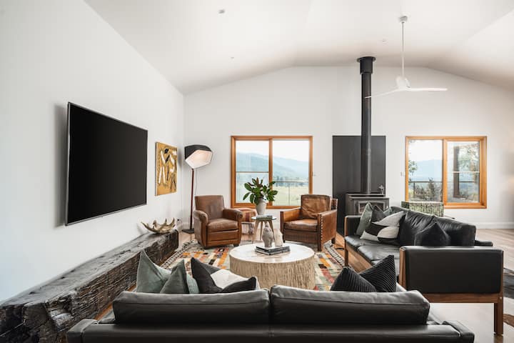 Enjoy the wood fire for ambiance and warmth on those stormy nights, sitting in the comfortable leather couches or at the spectacular dining table with soaring ceilings and huge picturesque, double-glazed windows looking out at the magnificent estate and valley.