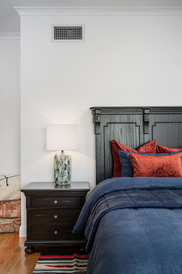 Featuring a large Black solid wood king bed, a grand feeling to the room with bold colours and Artwork by a Wangaratta based Artist and Margie Sheppard’s famous 2011 ‘Woman as a Landscape” piece that perfect ties in with the luxury, moody bed linens.
